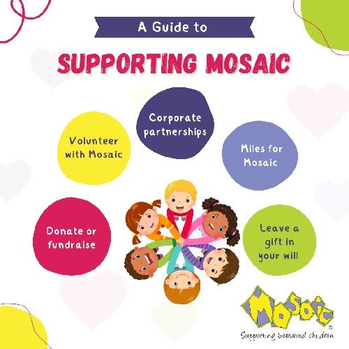 There are so many ways to get involved with Mosaic, whether you're a school, business or individual. Your support, whether through donations, fundraising or volunteering, helps us to ensure that bereaved children receive the care and support they need during the most difficult time in their lives. Together, we can make a difference and offer hope to those who need it most.