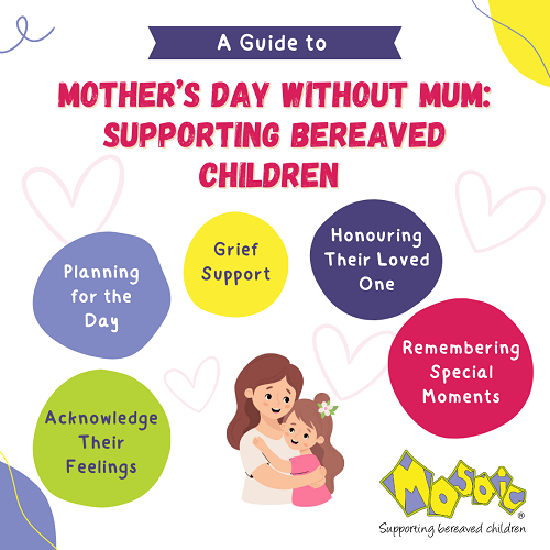 At Mosaic, we understand that Mother’s Day can be a difficult time for bereaved children and young people. We help children and families build strong connections with others who have experienced similar losses, creating a community of support. We offer a range of services to help them through their grief, not just on Mother’s Day but throughout the year.